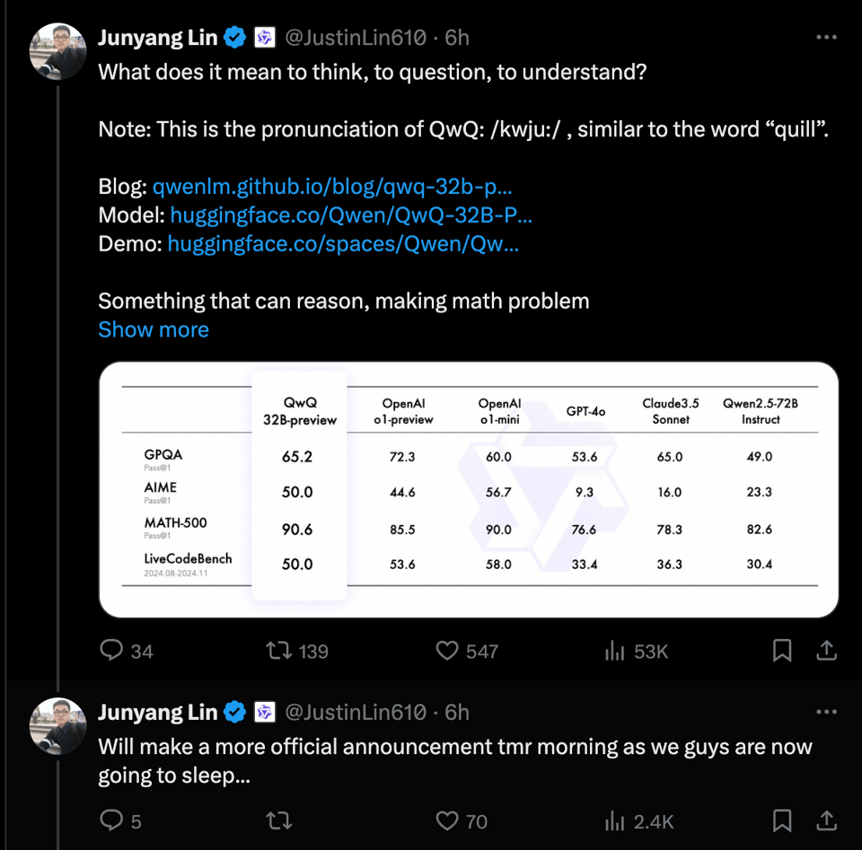[AINews] Qwen with Questions: 32B open weights reasoning model nears o1 in GPQA/AIME/Math500 • ButtondownTwitterTwitter
